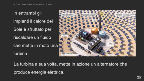 LE FONTI RINNOVABILI/LE CENTRALI SOLARI In entrambi gli impianti il calore del Sole è sfruttato per riscaldare un fluido che mette in moto una turbina. La turbina a sua volta, mette in azione un alternatore che produce energia elettrica.